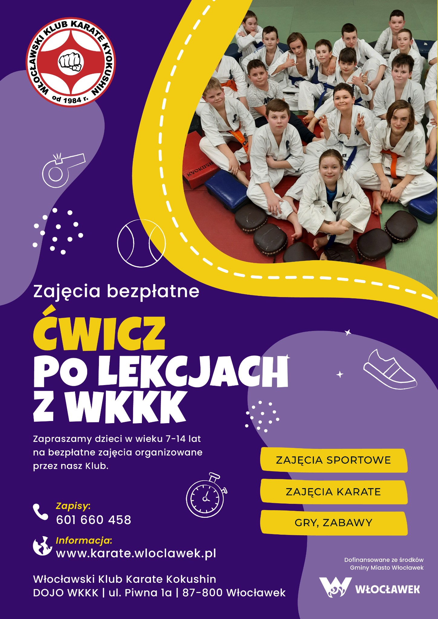 Zapraszamy dzieci w wieku od 7 do 14 lat na bezpłatne zajęcia sportowe i KARATE, organizowane przez Włocławski Klub Karate Kyokushin a dofinansowane ze środków Gminy Miasta Włocławek .